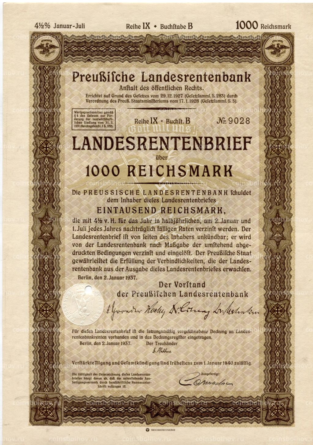 • Облигация 4,5% 1000 рейхсмарок 1937 года Германия
