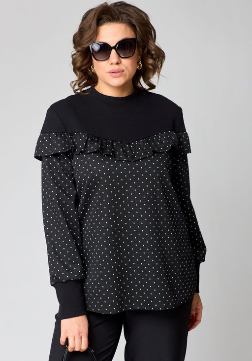 Блуза женская повседневная прямого силуэта. Выполнена из трикотажного полотна двух дизайнов. Вырез горловины мягкая стойка, рукав втачной по низу на притачной манжете. В боковых швах обработаны небольшие разрезы. Декором служат рюши из трикотажа по полочке и рукавам.­