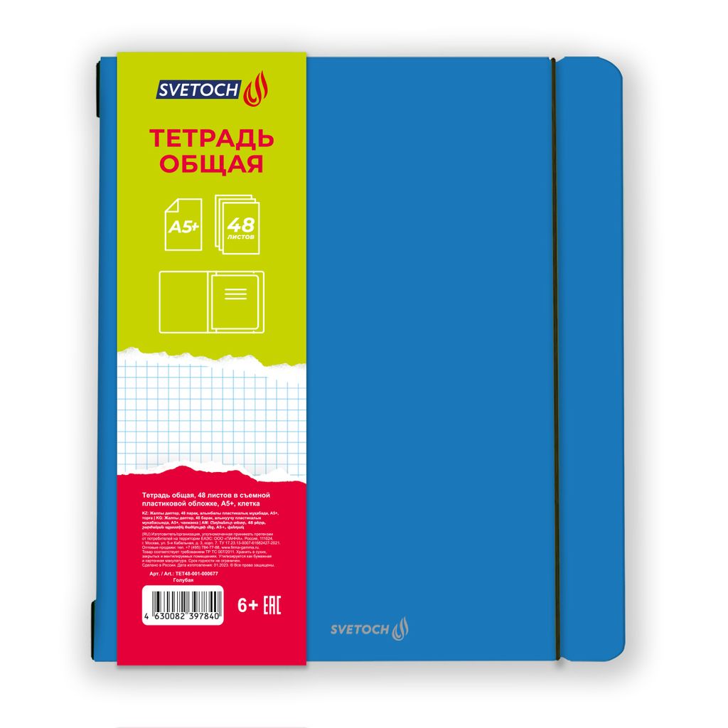 Тетрадь общая со съемной пластиковой обложкой, на резинках А5 формата, 48 листов, предназначена для учащихся средних и старших классов, учащихся вузов, а также прекрасно подойдет для дома и офиса. Пластиковая обложка не даст тетради помяться и порваться, резинки позволяют сменить тетрадь, держать тетрадь и папку всегда закрытой. Подойдут любые тетради формата А5. Внутренний блок изготовлен из качественной офсетной бумаги плотностью 65 г/кв. м, 100% белизны. Обложка -пластик 500 мкм. Линовка - клетка. Тетради упакованы в термоусадочную пленку по 4 штуки - 4 тетради одного цвета. В коробе находится 12 упаковок (48 шт) Сертификат или декларация соответствия Сертификат или декларация соответствия -- Характеристики -- Мин. кол-во для заказа: 4 Кратность: 4 Артикул: ТЕТ48-001 Белизна внутр. блока: 100 Вес единицы продажи (кг): 0.62 Вес отгрузочной упаковки, г: 652 Вид линовки: клетка Вид отделки: тиснение фольгой, фигурная вырубка по кра Вид скрепления: папка Вид тетради: общая Габариты отгрузочной упаковки, см: 21.5*18.2*4.2 Количество в транспортной упаковке: 12 Количество листов: 48 Количество, шт: 4 Марка: "Светоч" Материал обложки: пластик Наличие полей: Нет Объем единицы продажи, л: 1.64 Однотонный цвет обложки: Да Плотность внутреннего блока, г/кв.м: 65 Рекомендуемый возраст: от 6 лет Справочная информация: нет Страна происхождения: Россия Тип обложки: твердая Тип товара: Тетрадь Тип упаковки: в картонной упаковке Тип упаковки опт.ед.: в термоусадочной пленке Формат: A5 Цвет бумаги (блока): белый Артикул наименования: 000677 Праздник: 1 сентября - День знаний Тема рисунка: Надписи, Однотонные