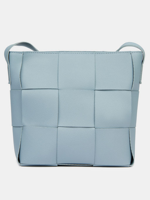 Сумка женская плетенка из экокожи зернистой фактуры. Закрывается на молнию, внутри есть карман для денег и документов. Носить удобно на плече или через плечо на длинном ремне. Крупное плетение из широких кожаных лент создает актуальную фактуру, такие сумки в тренде. Сумка плетеная благородного голубого цвета дополнит женственные образы в стилях casual и классика.