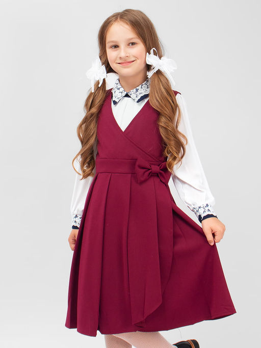 Очаровательный сарафан для девочки Соль&Перец из плотного трикотажа, с подкладом и юбочкой в складку. Сарафан декорирован бантиком из основной ткани. Износоустойчивый материал позволит надолго сохранить форму и привлекательный внешний вид изделия. Идеальный выбор для создания стильного, школьного образа.