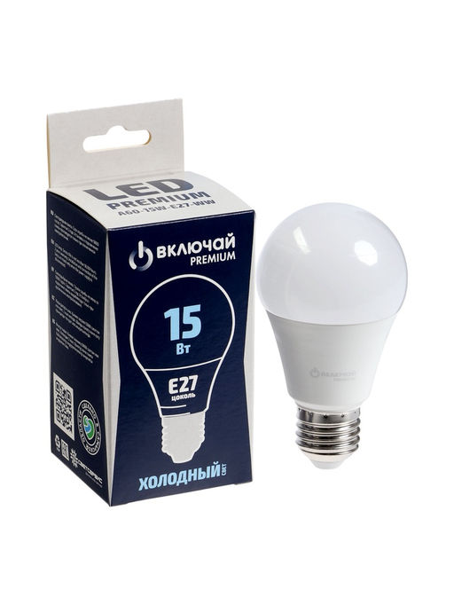 • Цена за 2 шт. Лампа светодиодная Включай, А60, 15 Вт, E27, 1425 Лм, 6500K, IP20, свечение холодное белое, матовое