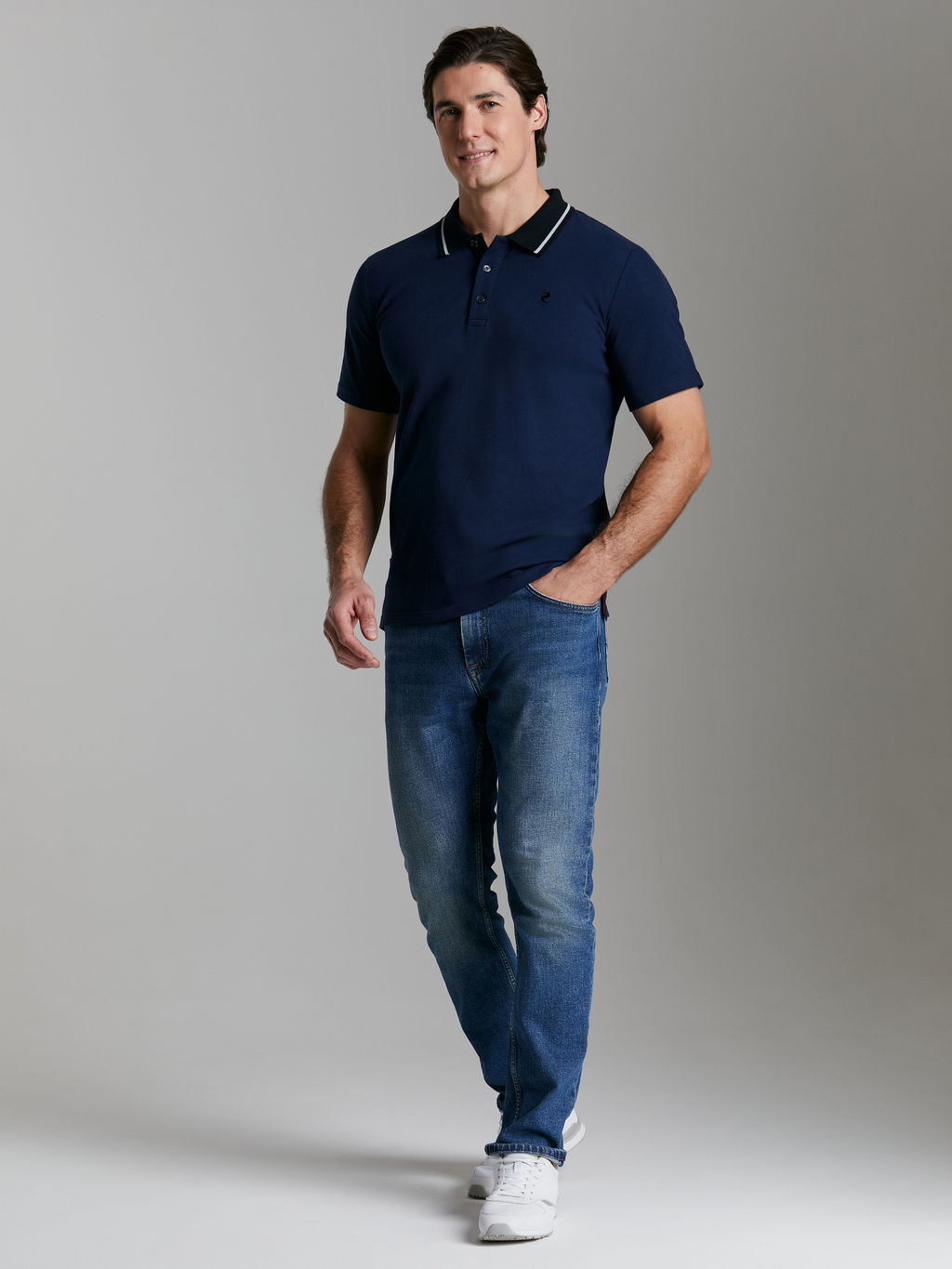 Футболка-поло из хлопкового полотна "пике". Классическая модель поло с короткими рукавами. Воротник и манжеты рукава выполнены из трикотажной рибаны темно-синего цвета с белой полосой. На полочке застежка-планка на пуговицах. На полочке вышивка "R". По низу футболки в боковых швах выполнены разрезы, обработанные тесьмой.
