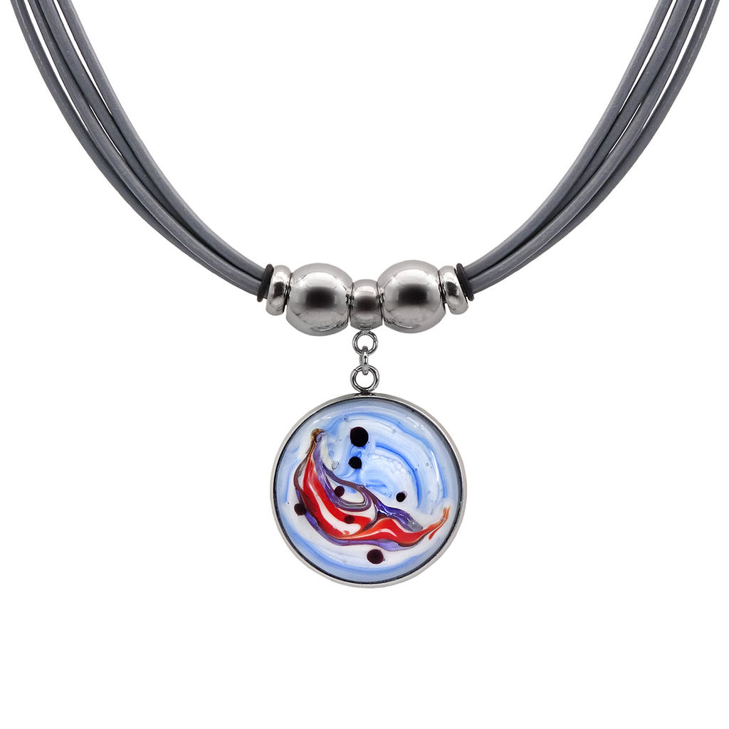 Колье изготовлено из натуральной кожи, муранского стекла и гипоаллергенной ювелирной стали, что очень важно для людей с чувствительной кожей. Металл не темнеет и не подвергается воздействиям окружающей среды, надолго обеспечивая красивый внешний вид изделия. Длина колье - 46 см + 5 см. удлиняющая цепочка. Диаметр стеклянного элемента - 2,5 см. Вес - 21 гр.­
