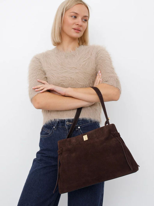 Вместительная модель, выполнена из замши. Дополнена золотистой фурнитурой. Данная модель закрывается на молнию, носится в руке за или на плече за встроенные ручки. Каркас жесткий.