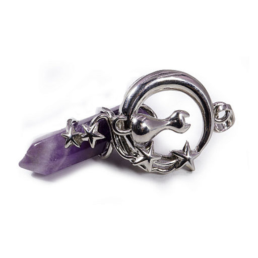 Подвеска-маятник Лунный котёнок. Волшебное украшение, сочетающее нежность и магическую силу. Изящный полумесяц из белого металла служит основой для этой очаровательной композиции. На изгибе месяца уютно устроился маленький котёнок. Вокруг полумесяца танцуют маленькие звездочки. К нижней части полумесяца крепится кристалл аметиста. Подвеска универсальна: её можно носить как обычное украшение на цепочке или кожаном шнурке, а в нужный момент использовать для биолокационных практик.