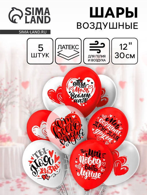 • Цена за 3 шт. Воздушные шары латексные 12" От Всего Сердца!, 5 шт., 2-сторонние, МИКС