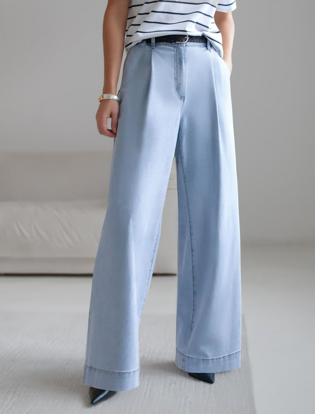 Широкие джинсы белого цвета выполенены из облегченного денима плотностью 8 OZ, они идеально подходят для весны и лета. После пошива изделие подвергли специальному виду вошинга salt-stone washing (солт-стоун вошинг), что дословно значит стирка с каменной солью. Такой вид вошинга позволяет получить стильные потертости на голубых оттенках денима. Модель дополнена защипами на поясе, которые формируют актуальный свободный крой. Джинсы палаццо идеально подойдут для девушек и женщин размера plus size (плюс сайз) с широкими бедрами и скроют недостатки, Высокая талия с защипами визуально корректирует фигуру и вытягивает силуэт. Качественная надежная фурнитура делает добавлет образу премиальности. Широкие легкие джинсы не стесняют движений, позволяя чувствовать себя комфортно даже в жаркую погоду. Джинсы палаццо идеальный баланс между расслабленным стилем и элегантностью, вариант для тех, кто ищет достойную альтернативу классике на каждый день.