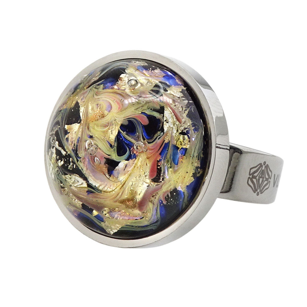 Кольцо изготовлено из муранского стекла и гипоаллергенной ювелирной стали, что очень важно для людей с чувствительной кожей. Металл не темнеет и не подвергается воздействиям окружающей среды, надолго обеспечивая красивый внешний вид изделия. Диаметр стеклянного элемента - 2 см. Кольцо безразмерное, регулируется с 16 до 19 размера. Вес - 8 гр.