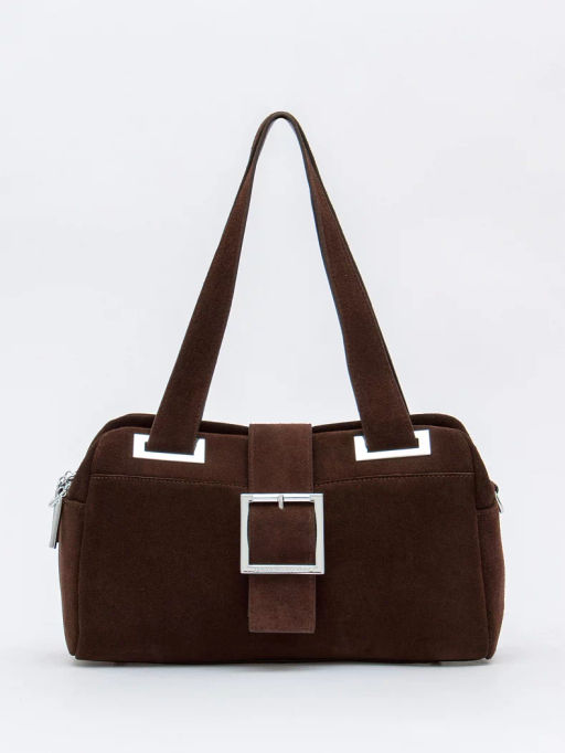 Базовая сумка на каждый день выполнена из натуральной замши. Декорирована пряжкой на хлястике. Дополнена серебристой фурнитурой.