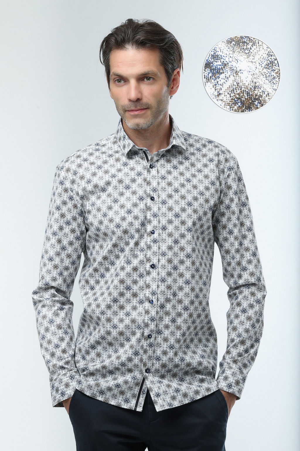 Бренд: Nicolo Angi Длина рукава рубашки: Длинный Карман: Без кармана Силуэт: Полуприталенный силуэт (regular fit) Состав: 97% хлопок, 3% лайкра Стиль: Кэжуал Узор (рисунок): Абстрактный Цвет: Бежевый