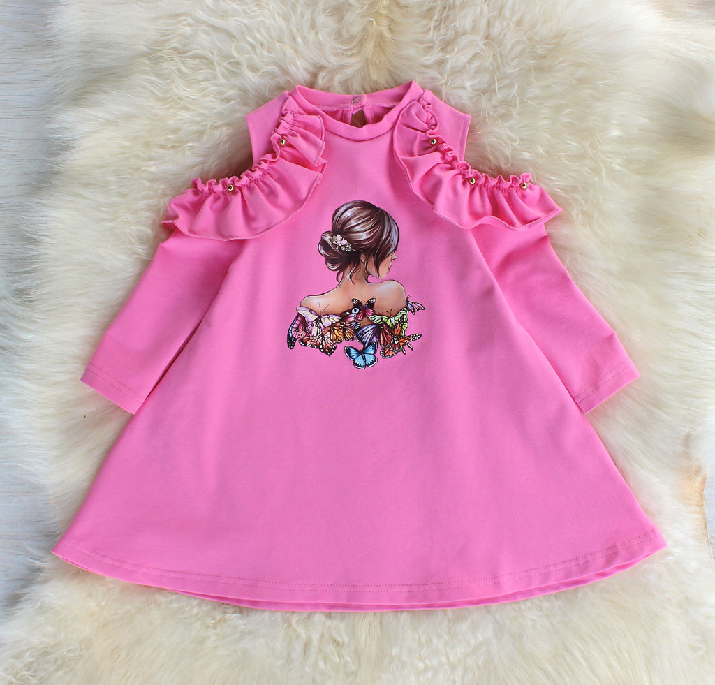 Платье детское из футера 2-х нитки А-силуэта, с длинными рукавами с декорированными рюшей открытыми плечиками. Украшена бусинами и принтом.