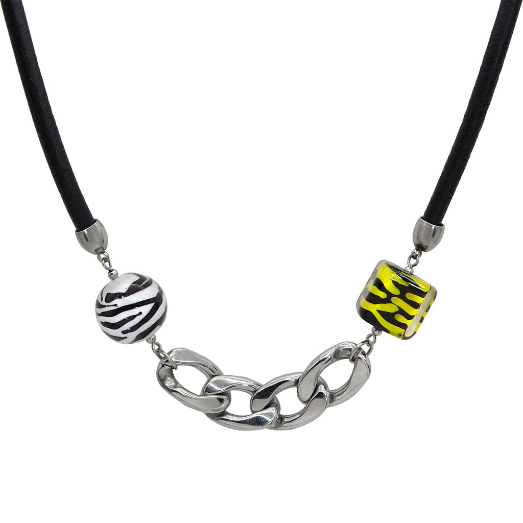 Колье изготовлено из натуральной кожи, муранского стекла и гипоаллергенной ювелирной стали, что очень важно для людей с чувствительной кожей. Металл не темнеет и не подвергается воздействиям окружающей среды, надолго обеспечивая красивый внешний вид изделия. Длина колье - 55 см + 5 см. удлиняющая цепочка. Диаметр стеклянного шара - 1,8 см. Размер стеклянного куба - 1,6 см. Вес - 53 гр.