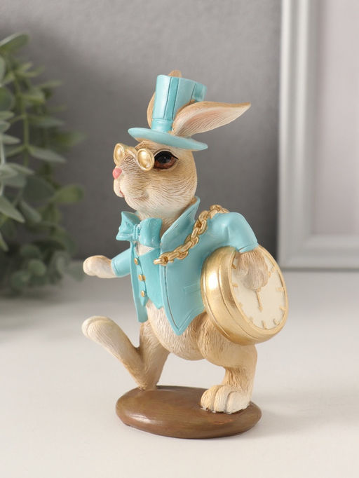 Эта голубая фигурка зайца в пенсне детализированная статуэтка для ценителей необычного декора. Персонаж, замерший в раздумьях над карманными часами, создаёт атмосферу уютной философии и ностальгии. Фигурка выполнена из полистоуна, что гарантирует её долговечность и тщательную проработку каждой черты. Особенности * Материал: прочный и детализированный полистоун. * Цветовое решение: сложный голубой оттенок с художественными переходами. * Размер: компактная высота 14 см позволяет разместить на книжной полке, рабочем столе или в серванте. * Дизайн: уникальный образ зайца-интеллектуала с карманными часами и пенсне. * Универсальность: подходит для пасхального оформления и как акцент в интерьере в стиле шебби-шик или классика. Создайте свою историю Статуэтка Задумчивый кролик становится молчаливым собеседником и хранителем времени. Она вносит в пространство элемент сказки и камерности, отсылая к образам классической литературы. Это готовый сюжет для коллекции фигурок или самостоятельный выразительный подарок, который оценят за тонкий юмор и искусное исполнение.