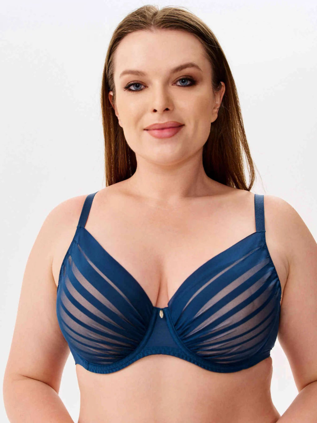 Стильный синий бюстгальтер c формованными чашками на каркасах. Чашки с боковой корректирующей деталью. Выполнен из эластичного кружева и эластичного полотна.