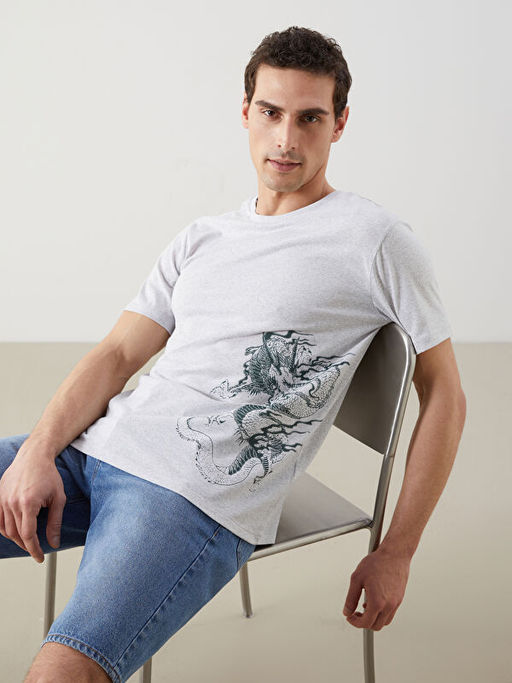 • Bisiklet Yaka Bask?l? Penye Erkek Ti??rt