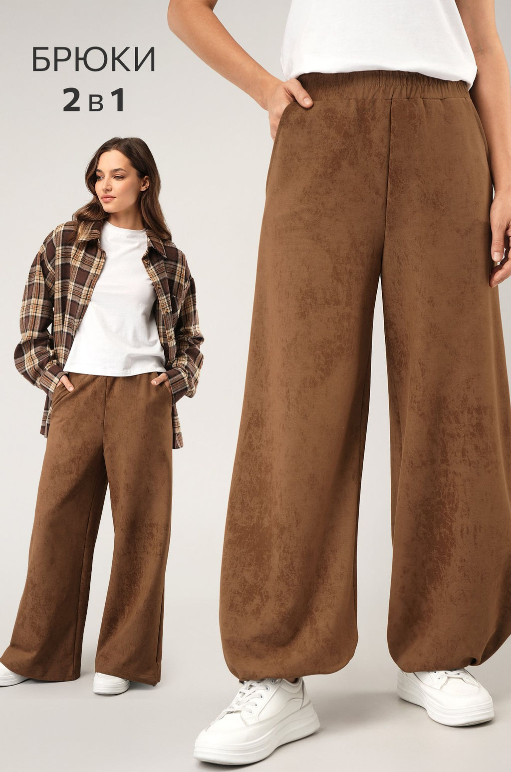 Состав: 74% хлопок, 21% полиэстер, 5% лайкра Женские брюки 2 в 1 от Happyfox легко станут любимыми! Удобные, эластичные и стильные, они созданы для того, чтобы чувствовать себя свободно и уверенно. Спортивные штаны карамельного цвета сочетают комфорт хлопка и функциональность деталей, делая их универсальными для осени и весны. Преимущества: выполнены из мягкого трикотажа с добавлением лайкры; плотные хлопковые брюки держат форму и не растягиваются (плотность 240 г/м2); высокая посадка подчеркивает талию; утяжка со стопперами по низу позволяет легко превратить брюки палаццо в джоггеры; внутренние карманы для удобства. Широкие однотонные брюки свободного кроя идеально подойдут для осенних прогулок, активного весеннего отдыха или расслабленных домашних вечеров. Базовые трикотажные штаны для женщин станут универсальным выбором на каждый день, когда хочется комфорта и легкости в движении. Размер 44: длина внешн.шва:104 см; длина внутр.шва:72 см; ширина по бедрам:47 см. Размер 46: длина внешн.шва:106 см; длина внутр.шва:73 см; ширина по бедрам:49 см. Размер 48: длина внешн.шва:108 см; длина внутр.шва:74 см; ширина по бедрам:51 см. Размер 50: длина внешн.шва:110 см; длина внутр.шва:75 см; ширина по бедрам:53 см. *замеры выборочные, могут незначительно отличаться. Видео https://img0.happywear.ru/videos/H/F/HFG093_винтаж.карамельный_video.mp4