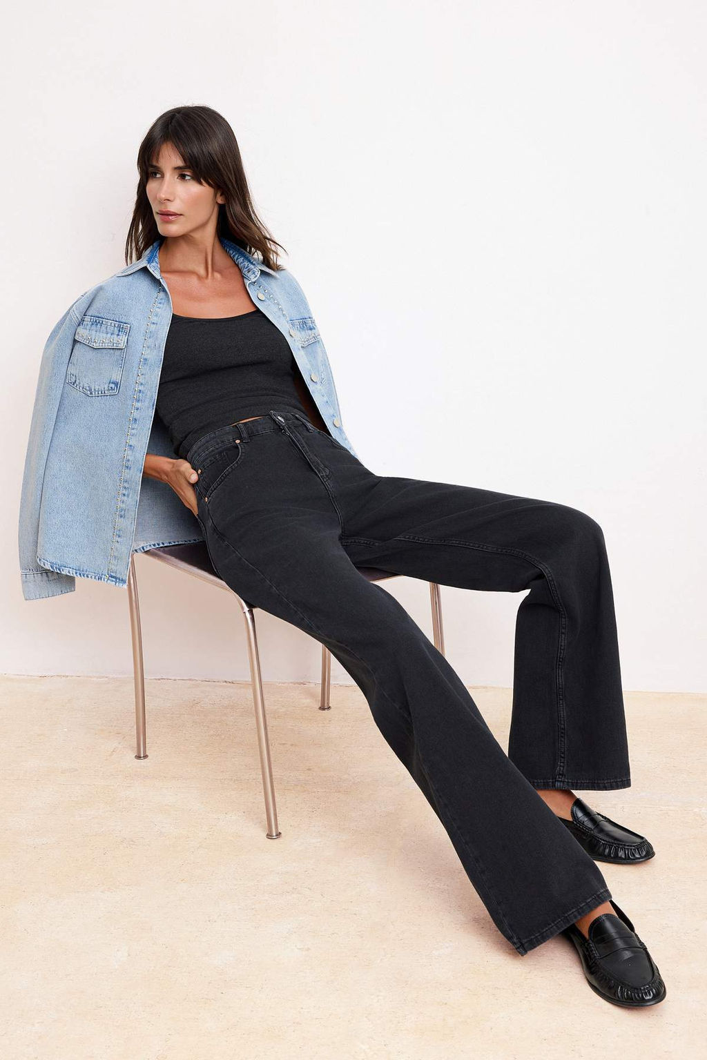 Siyah DOKUMLU Yuksek Bel MEVSIMLIK %100 Pamuk Uzun Boy Wide Leg Jeans TWOSS26JE00127