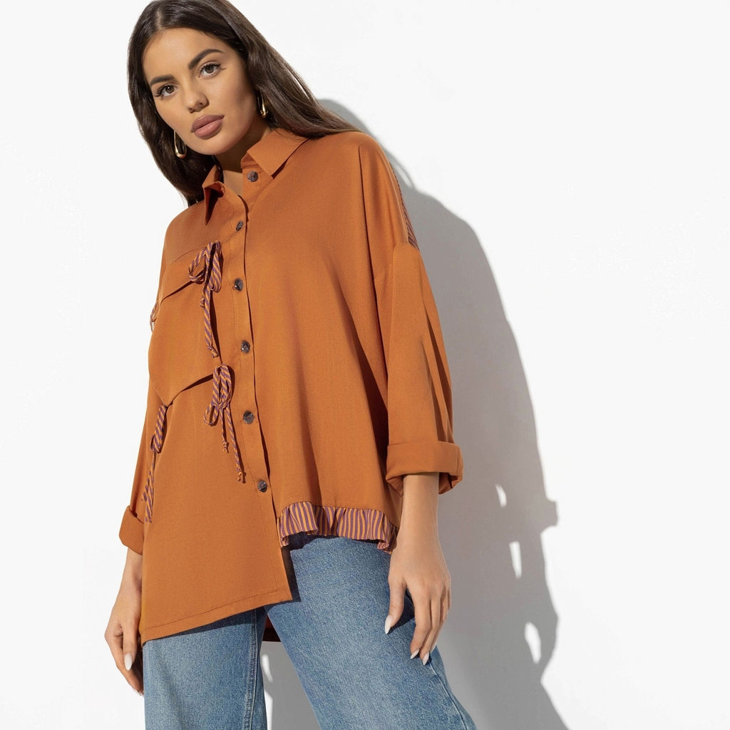 Принимай внезапное приглашение на кофе. Только накинь сверху рубашку ЧАРУТТИ. Благородный медный цвет, детали и расслабленный стиль придадут нужную атмосферу и следующий кофе будет уже в более романтичной обстановке. Рубашка из вискозы в комбинации тканей. Объемный акцентный карман, классический ворот. Асимметричный крой подола и рюша по одной стороне рубашки. Акцентная ткань в полоску на линии плеч сзади.­