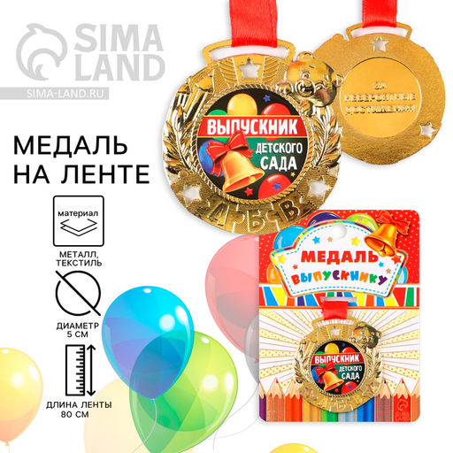 Медаль детская на Выпускной «Выпускник детского сада», на ленте, золото, металл, d = 5,5 смВыпускной – это важное событие для ребенка. Медаль на ленте является прекрасной наградой и запоминающимся подарком, который подчеркнет значимость мероприятия.- размер медали 5,1 х 5,5 см.;- диаметр рисунка 3 см.;- длина ленты (в сложенном виде) 40 см. Для кого: Для девочки. Для кого: Для мальчика. Длина ленты, см: 40. Вид упаковки: Пакет. Вид упаковки: Подложка. Тематика праздника: Выпускной в детском саду. Адресат: Выпускнику детского сада. Наличие символики РФ: Нет. Наличие ленты: Да. Бесплатная доставка: Да. Наша разработка: Да. Размеры товара: 0.2/5.5/5.1.