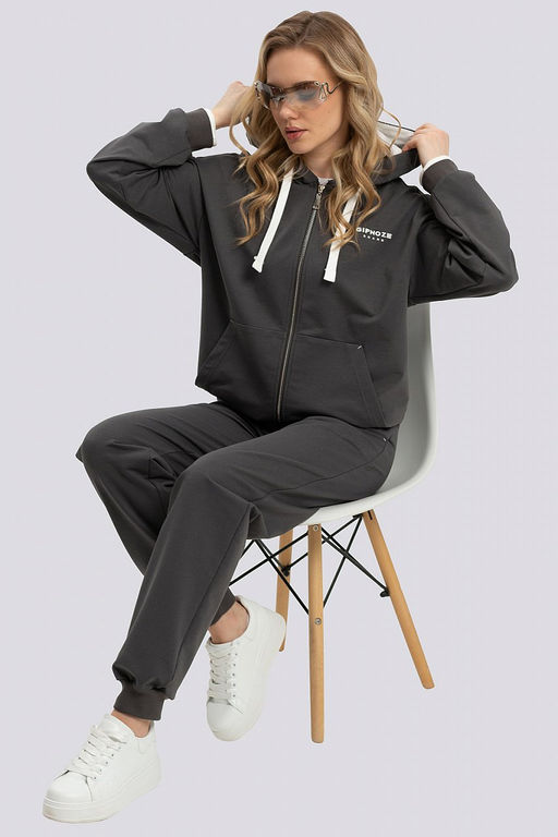 Спортивный костюм на молнии с капюшоном идеальный выбор на весну и осень. Стильный трикотажный комплект из высококачественного материала обеспечивает удобство и комфорт во время прогулок или занятий спортом. Демисезонная базовая модель прекрасно подчеркнет все достоинства фигуры. Толстовка оверсайз кроя на молнии дополнена удобным карманом по переду, а низ изделия и рукава оформлены трикотажной манжетой, обеспечивающей оптимальную посадку и защиту от ветра. Брюки свободного кроя с поясом на резинке и эластичными манжетами внизу лучший вариант повседневной одежды. Карманы в шве добавляют практичности и функциональности. Модный женский костюм выполнен в классическом стиле, что позволяет легко комбинировать его с другими предметами гардероба. В качестве отделки на капюшоне и манжетах используется белый трикотаж, придающий образу свежесть и элегантность. Брендированные наклейки подчеркивают эксклюзивность и внимание к деталям. Состав трикотажа: 75% хлопок, 20% полиэстер, 5% спандекс.­