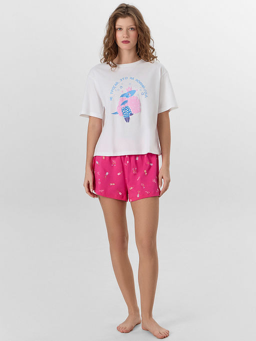 Футболка свободного кроя со слегка спущенной линией плеча обеспечивает комфорт во время сна. Круглая горловина и короткие рукава с аккуратной обработкой срезов гарантируют удобную посадку. Шорты с эластичным поясом мягко фиксируются на талии, не оставляя следов.