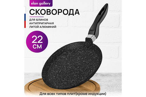 Сковорода блинная Elan Gallery "Гармония вкуса" в оттенке "Чёрный мрамор" диаметром 22 см равномерно разогревается и распределяет тепло таким образом, чтобы продукты сохраняли все свои полезные и вкусовые свойства. Сковорода изготовлена из литого алюминия и имеет ультрапрочное двухслойное антипригарное покрытие Cookmark. Оно защищает блинчики от пригорания и позволяет переворачивать их лопаткой без особого труда. Выполнена в стильном дизайне. Покрытие устойчиво к царапинам и износу, полностью безопасно для здоровья и не содержит PFOA или других вредных веществ. Готовьте блины идеальной формы на завтрак и радуйте ими своих близких! Эксплуатация: не нагревать без продуктов. Дайте посуде остыть, прежде чем помещать ее в воду. Использовать только деревянные и силиконовые приборы. Не мыть абразивными или щелочными моющими средствами. Использовать в посудомоечной машине только в режиме "Эко" с применением средств, не содержащих щелочи. Подходит для всех типов плит, кроме индукционных. Блинница станет идеальным подарком для женщин и придаст процессу приготовления пищи новый уровень комфорта. Подарите универсальную кухонную утварь вещь маме, подруге, сестре или тёте. Хорошая блинная сковородка мечта любой хозяйки! В серии "Гармония вкуса" вы найдёте любые кухонные принадлежности и инвентарь для вашего дома. Соберите набор для вашей кухни в едином стиле!