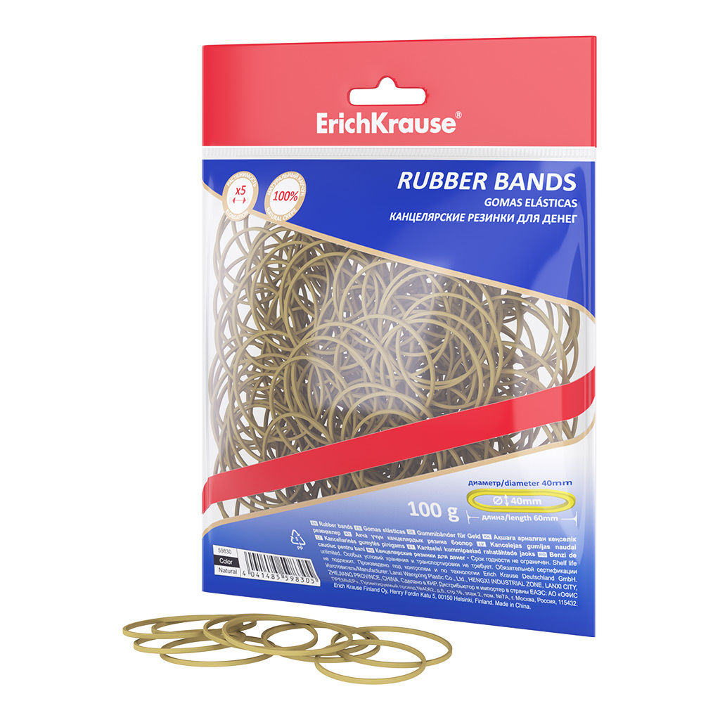 • АКЦИЯ Цена за 1 шт. Канцелярские резинки для денег ErichKrause диаметр 40 мм/длина 60 мм, натур.цвет (в пакете с европодвесом по 100г.)