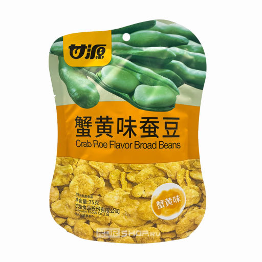 Бобовые снеки со вкусом крабовой икры Ganyuan популярная в Поднебесной закуска с необычным пикантным вкусом, который придется по душе любителям морепродуктов. Бобовые снеки покрыты хрустящей глазурью на основе жареного теста из рисовой муки с добавлением приправ из высушенных и перемолотых в порошок даров моря - крабовой икры, крабового мяса, морских гребешков и сушеной рыбы, дополненных специями, солью, сахаром и соевым соусом. Эти интересные и вкусные снеки понравятся любителям орешков и чипсов со вкусом морепродуктов. Бобы со вкусом крабовой икры можно использовать для украшения салатов и как топпинг к отварному рису.