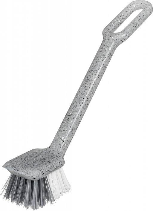Щетка для мытья посуды имеет удобную эргономическую ручку с отверстием для размещения на крючке. Ворс щетки прочный и не деформируется при высоких температурах воды. На головке щетки расположен удобный скребок для снятия особо стойкого загрязнения.