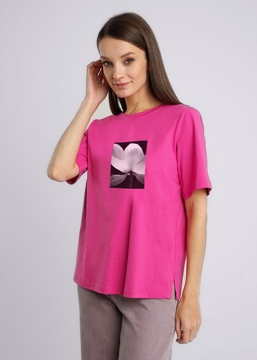 Джемпер оверсайз из хлопкового трикотажного полотна. Короткий втачной рукав. Круглый вырез горловины обработан рибаной. По бокам разрезы. По переду термонаклейка. 100% хлопок
