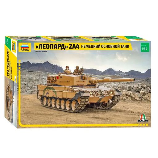 Звезда 3703 сборная модель немецкого танка Леопард модификации 2А4 в масштабе 1/35. ВНИМАНИЕ! Клей и краски в комплект не входят и приобретаются отдельно. Моделистам младше 10 лет может понадобиться помощь взрослых при сборке модели. Длина собранной модели 28 см., деталей 200 шт. Корпус танка выполнен с высокой детализацией. Проработано и выполнено отдельными деталями навесное оборудование в виде пулемета, инструмента, тросов, дымовых гранат, поручней, люков на башне и прочего оборудования. Гусеница выполнена одной деталью из мягкого пластика. В комплекте декали для обозначения принадлежности танка к вооруженным силам Турции, Германии, Испании, Швейцарии и Польши. Танк Леопард 2 выпускается с 1979 года, имеет множество модификаций и состоит на вооружении 19 стран мира.