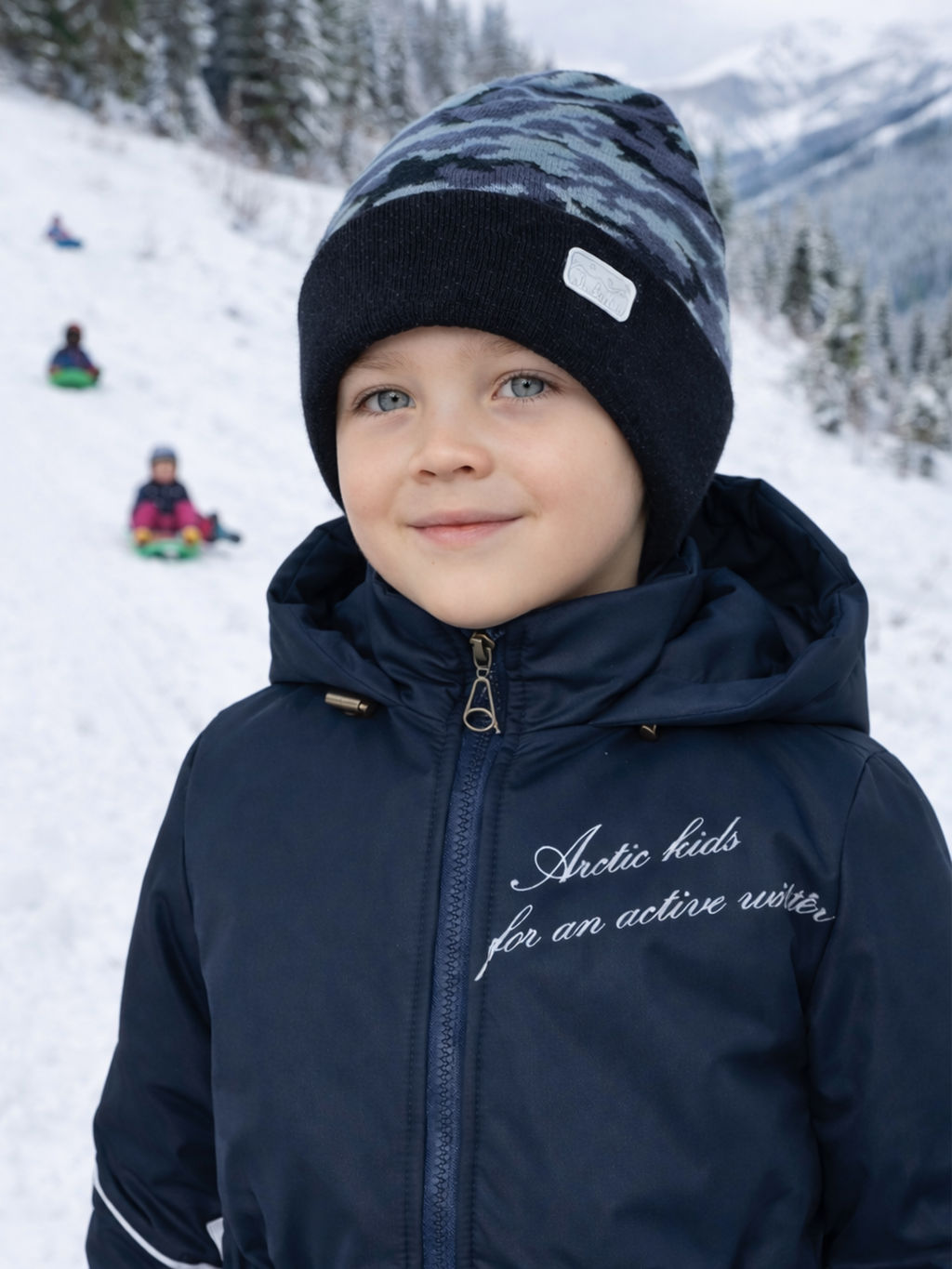 Детская теплая вязаная двухслойная шапка для повседневной носки. Интересный камуфляжный узор и однотонный отворот. Связана шапка из мягкой, износостойкой и приятной на ощупь акриловой пряжи с добавлением мериноса. Спереди небольшая светоотражающая нашивка. Такая шапочка по температурному режиму подходит для осени и зимы. Ребёнок в такой шапке будет выделяться среди других детей.