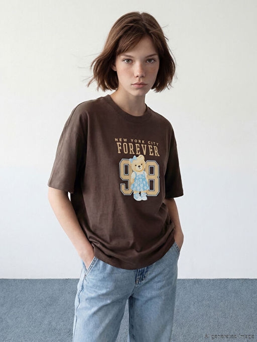 • Bisiklet Yaka New York Bask?l? Kad?n Ti??rt