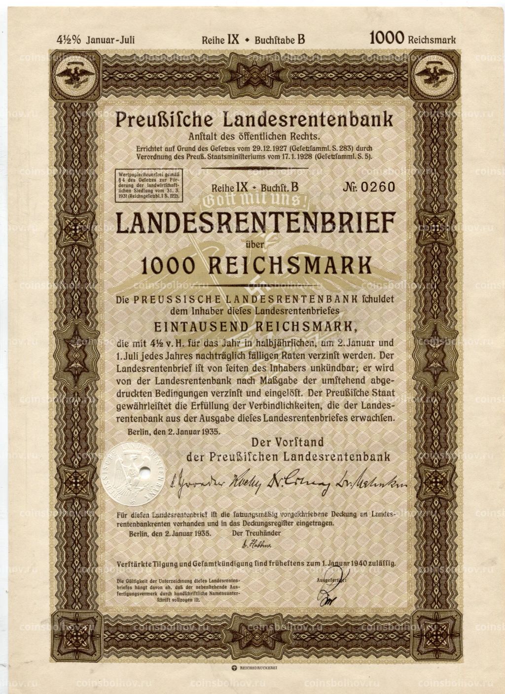 • Облигация 4,5% 1000 рейхсмарок 1935 года Германия