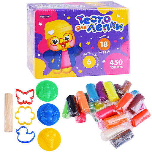 • Тесто для лепки, тесто 450 гр, 18 цветов, 6 форм, скалка