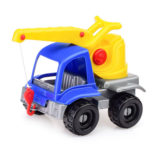 • Машинка выполнена в ярких цветах и оснащена вращающейся платформой со стрелой и механизмом подъёма крюка.