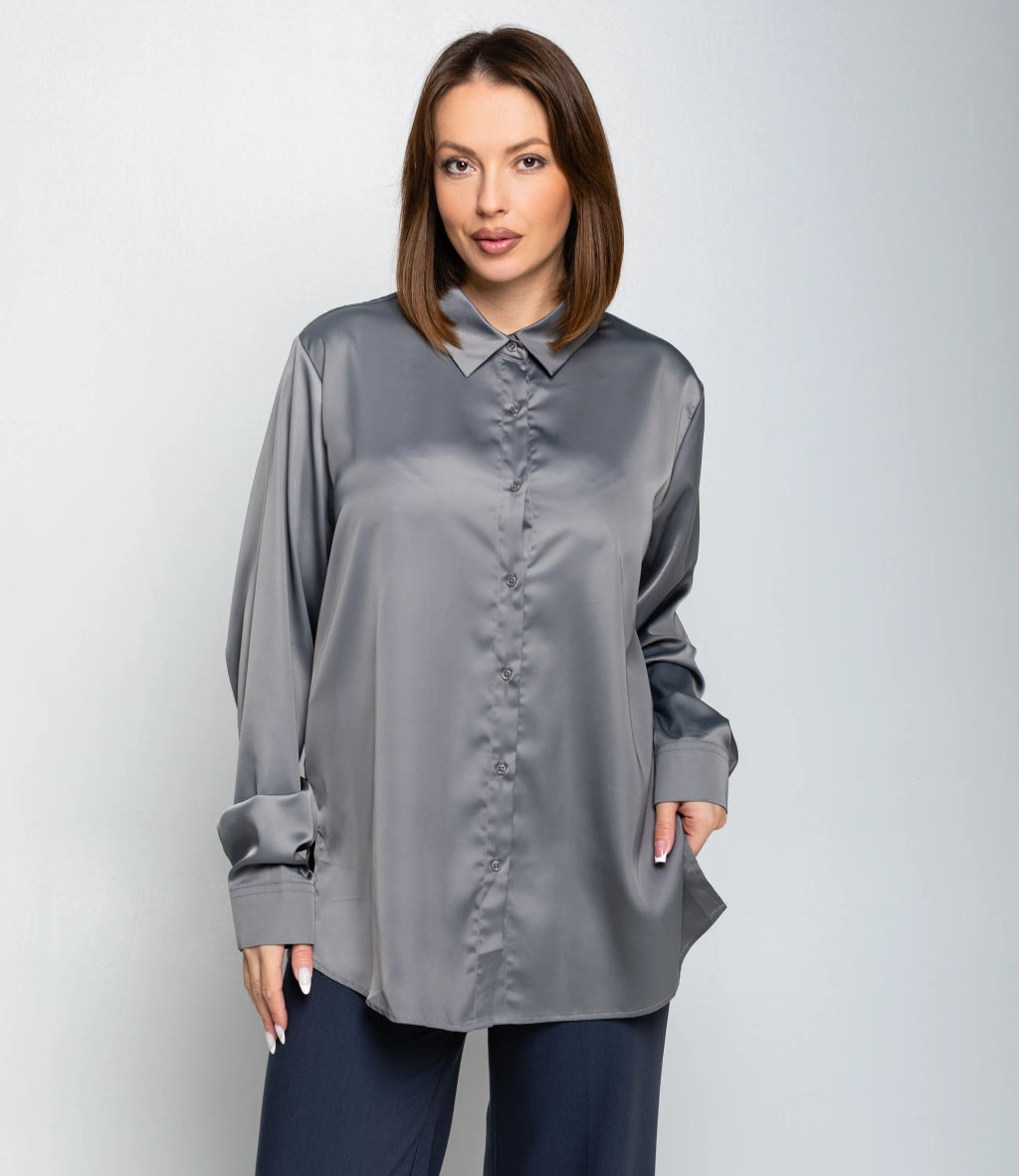 Рубашка это часть гардероба, которая подчёркивает привлекательность и индивидуальность любой женщины. Рубашка прямого свободного кроя, слегка удлинённая, с классическим отложным воротником и центральной планкой на пуговицах; втачные длинные рукава с прямоугольными манжетами на пуговицу, округлённый нижний край с удлинением по спинке и боковыми разрезами для удобства движения, отсутствие нагрудных карманов подчёркивает минималистичную линию; лёгкий гладкий материал средней плотности с мягкой драпировкой и небольшим блеском, аккуратно обработанные швы и скрытая строчка на планке, прочные закрепки в зонах нагрузки, посадка с запасом в области плеч и груди для расслабленного, но аккуратного силуэта, универсальная базовая модель для деловых и повседневных образов. Для пошива использована ткань: 95% полиэстер, 5% спандекс. Мы предлагаем выгодные оптовые условия, гибкую ценовую политику и надёжные поставки для магазинов. Установленная цена адекватна и позволит вам формировать привлекательную наценку и обеспечивать высокую оборотность. Предложите своим покупательницам рубашку, сочетающую комфорт, качество и повседневную элегантность. -- Характеристики -- Цвет: серый Пол: Женский Страна производитель: Китай Сезон: Демисезон Материал: Полиэстер, Спандекс