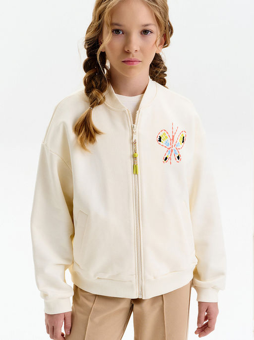 Толстовка oversize для девочки. Модель средней длины из мягкого хлопкового футера, плотностью 342 гр/кв м. Свободный крой с объёмом по линии груди и низа, мягкое спущенное плечо. Застёжка на центральную молнию. Узкий воротник-стойка и плотные манжеты на рукавах и по низу изделия из эластичной рибаны создают стильную имитацию бомбера. По бокам удобные прорезные карманы с листочки. Перевод: ПУРРР ФЕКТ(ПЕРФЕКТ)