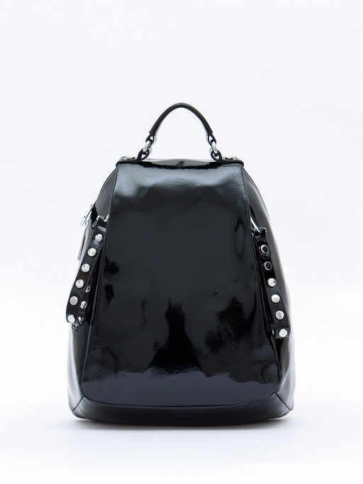 Классический рюкзак, выполнена из натуральной лаковой кожи. Дополнен серебристой фурнитурой. Данная модель закрывается на молнию. Носится в руке за петельку. Или на плече, встроенные ремни регулируются по длине. Каркас полужесткий.