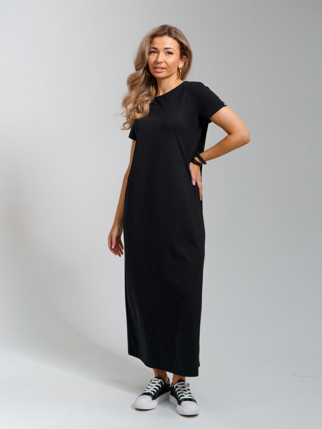 Стильное женское платье из кулирки с лайкрой пенье идеальный выбор для летнего гардероба! Элегантный прямой крой с коротким втачным рукавом и А-силуэт с округлой горловиной подчеркивают женственность, сохраняя максимальный комфорт. Универсальный фасон легко сочетается как с классической обувью, так и со спортивными моделями, а эластичная дышащая ткань (92% кулирка, 8% лайкра) обеспечивает приятное ношение даже в самую жаркую погоду.