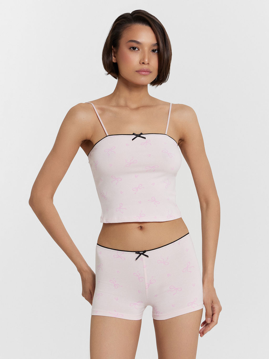 Эта нежная женская пижама идеальное сочетание комфорта и очаровательного дизайна! Топ прилегающего силуэта с тонкими бретелями подчеркнет женственность, создавая элегантный и легкий образ. Аккуратная обработка низа швом вподгибку обеспечивает комфорт и эстетичность. Укороченные шорты прилегающего силуэта гармонично дополняют комплект, а эластичная талия с миниатюрным бантиком придает очаровательный акцент. Нижний срез также обработан швом вподгибку, что гарантирует долговечность и удобную посадку. Изделие выполнено из хлопковой кулирки мягкого, воздухопроницаемого материала, который приятно прилегает к коже, обеспечивая комфорт и легкость в течение всей ночи. Эта пижама создана для тех, кто ценит уют, элегантность и качественные ткани. Прекрасный вариант для приятных вечеров и комфортного сна!­