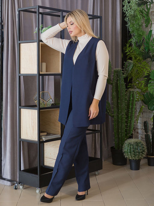 Повседневный удлиненный жилет прямого силуэта, выполнен из эластичной костюмной ткани. Жилет по переду с фигурными отрезными бочками. В швах притачивания бочков расположены удобные карманы. Спинка целая. Жилет без подклада. Длина изделия по спинке в 50 р-ре 79 см. в 64 р-ре 87 см.