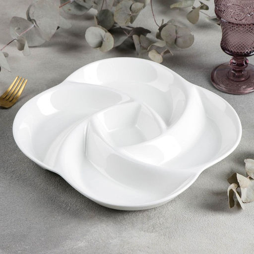 Посуда Wilmax – это плавные линии, кристальная прозрачность и безукоризненное качество.Преимущества изделий:ударопрочность в соответствии со стандартами EC;долговечность;стойкость к термическому воздействию;способность удерживать тепло;можно ставить в микроволновую печь;низкая водопоглощаемость (менее 0,1%) — посуда не впитывает запахи, её легко мыть.Характерная особенность фарфора Wilmax это его прозрачность, которая делает изделия изящными. Такая полупрозрачность свойственна только высококачественному фарфору: поднесите изделие к источнику света, приложите руку, и вы увидите ладонь на просвет.Немного историиИстория бренда WilmaxEngland начинается с открытия небольшой мануфактуры в Великобритании, поставлявшей изысканную полупрозрачную фарфоровую посуду Королевскому двору.В 2001 году, в связи с возросшей популярностью белого фарфора, собственники предприятия приняли решение о значительном расширении бизнеса. Производство размещено в Юго-Восточной Азии для обеспечения оптимального соотношения цены и качества.КачествоИзготовление ведётся по отработанной технологии.Весь процесс находится под контролем технологов из европейского офиса компании.Дизайн посуды идентичен европейской линейке.Все изделия производятся из экологически чистого сырья с соблюдением санитарно-эпидемиологических требований. Посуда безопасна для здоровья, что подтверждается многочисленными лабораторными тестами.Посуда Wilmax рассчитана на интенсивное профессиональное использование: её можно мыть в посудомоечной машине без потери качества.Всё это позволяет с гордостью назвать продукцию торговой марки Wilmax — королевской! Продуманная до мельчайших деталей, она займёт главное место на вашей кухне и станет жемчужиной любого застолья. Набор: Нет. Форма: Фигурная. Диаметр, см: 27. В наборе, шт.: 1. Количество ячеек: 5. Тематика: Однотонная. Рисунок: Нет. Крышка: Нет. Можно мыть в посудомоечной машине: Да. Можно использовать в СВЧ-печи: Да. Текстура: Гладкая. Особенности: Без особенностей. Матовая поверхность: Нет. Бесплатная доставка: Да. Размеры товара: 27/3.5/26.