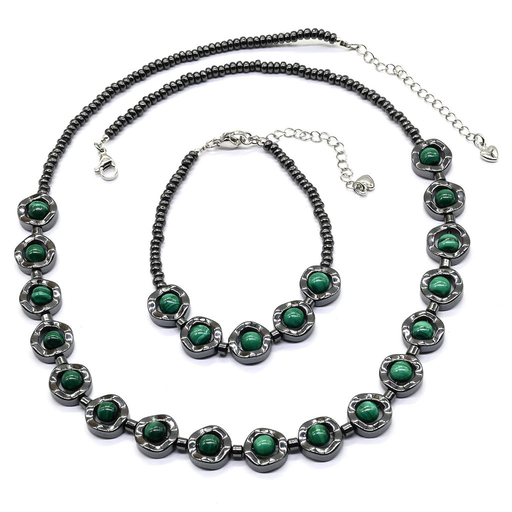 Колье с браслетом из гематита круг 12мм с малахитом, 49см, 18см Радуга камня