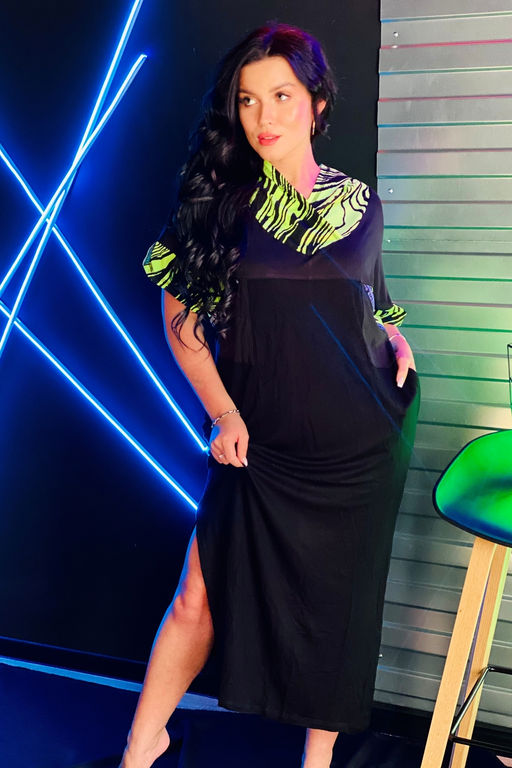 Платье женское прямого силуэта с капюшоном. Рукав цельнокроенный короткий со швом. Капюшон, манжеты рукава и обтачки накладных карманов на полочке из отделочной ткани. В боковом шве внутренние карманы. Верхняя часть спинки и полочки, накладные карманы из кашкорсе, нижняя часть платья из плотной вискозы. В боковых швах разрезы.