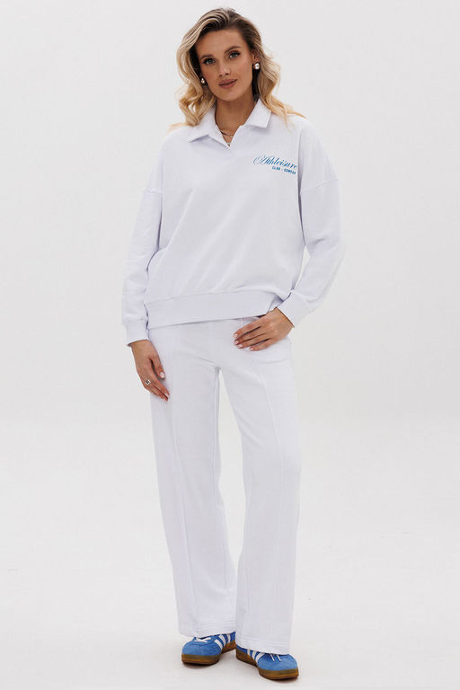 Состав: ПЭ-20%; Хлопок-80%; Для очаровательного образа не хватает воротничка! Воротник маленькая деталь, которая смягчает и делает нежным весь аутфит. Брюки со стрелками добавят образу строгости и деловитости, что позволит носить костюм как на прогулки, так и в офис. Свитшот: - отложной воротник - свободный силуэт - контрастная печать на левой стороне переда - манжеты рукавов и низ свитшота из ткани кашкорсе Брюки: - прямой силуэт - удобные карманы - стрелки по переду зафиксированы строчкой - пояс из ткани кашкорсе с резинкой и шнуром Длина свитшота по спинке 65-68 см. Длина рукава свитшота с плечом: 69-71 см для роста 164-170 см, 72-74 см для роста 170-176 см. Полуобхват груди свитшота: 42 р. - 66 см, 44 р. - 68 см, 46 р. - 70 см, 48 р. - 72 см, 50 р. - 74 см, 52 р. - 76 см. Длина брюк по боковому шву с поясом: 102-104 см для роста 164-170 см, 105-107 см для роста 170-176 см. Полуобхват бедер брюк: 42 р. - 48 см, 44 р. - 50 см, 46 р. - 52 см, 48 р. - 54 см, 50 р. - 56 см, 52 р. - 58 см. -- Характеристики -- Состав: ПЭ-20%; Хлопок-80%; Сезон: Весна Рост: 164 Страна бренда: Беларусь