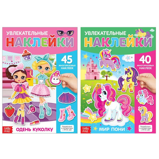 Набор многоразовых детских наклеек включает в себя 2 издания разной тематики: Одень куколку и Мир пони. Превращайте обучение в увлекательную игру, меняйте наряды для куколок и заселяйте волшебный мир пони сказочными существами.