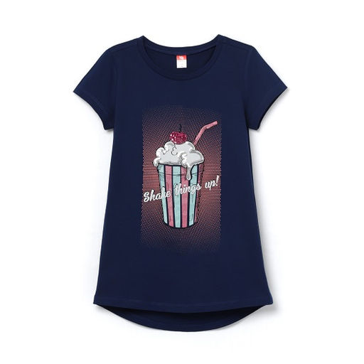 Футболка для девочки с короткими рукавами и округлой линией низа. Спинка длиннее переда на 3 см. Перед футболки декорирован принтом.