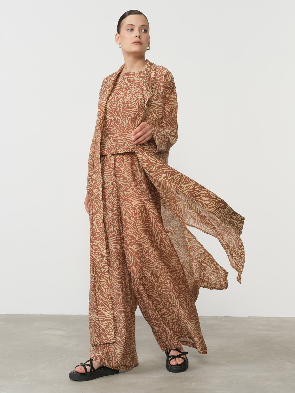 Свободный крой в азиатском стиле создает эффектный силуэт и обеспечивает свободу движений, а длинный фасон визуально стройнит и придает образу элегантность. Выразительный принт делает этот жакет ярким акцентом в любом ансамбле, а широкий пояс позволяет подчеркнуть талию и создать женственный силуэт.
